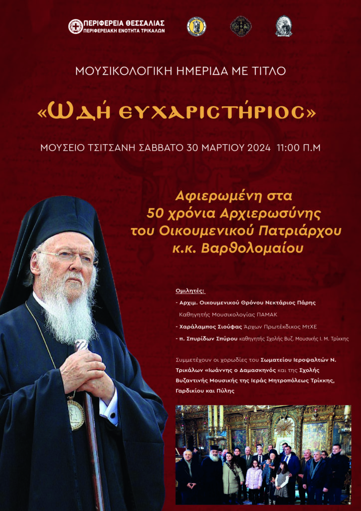 Μουσικολογική ημερίδα με τίτλο «ΩΔΗ ΕΥΧΑΡΙΣΤΗΡΙΟΣ» αφιερωμένη στα 50 χρόνια Αρχιερωσύνης του Οικουμενικού Πατριάρχη κ.κ. Βαρθολομαίου διοργανώνει το Σωματείο Ιεροψαλτών Νομού Τρικάλων «Ιωάννης ο Δαμασκηνός» στο Μουσείο Τσιτσάνη στα Τρίκαλα το Σάββατο 30 Μαρτίου 2024 στις 11:00 π.μ.
