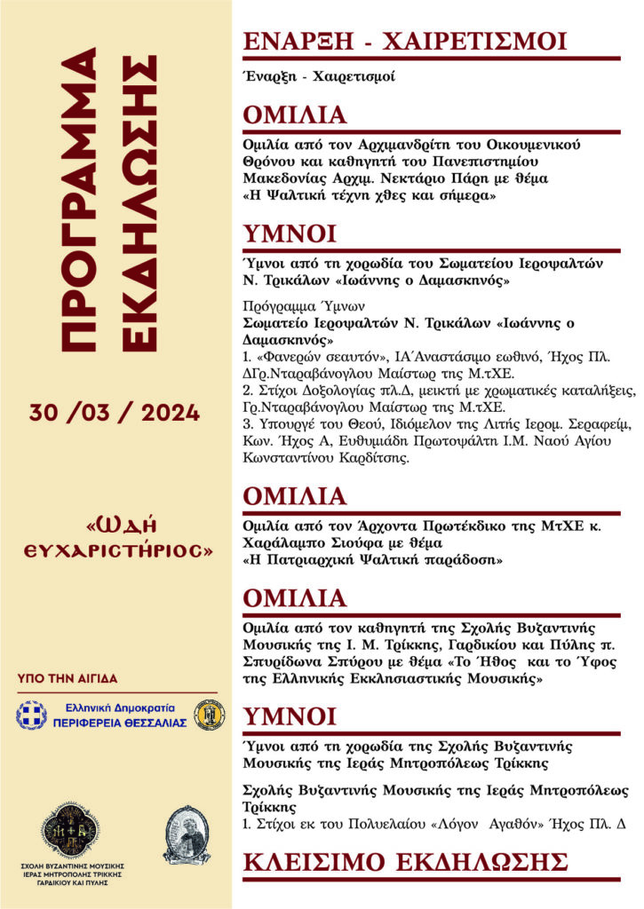 Μουσικολογική ημερίδα με τίτλο «ΩΔΗ ΕΥΧΑΡΙΣΤΗΡΙΟΣ» αφιερωμένη στα 50 χρόνια Αρχιερωσύνης του Οικουμενικού Πατριάρχη κ.κ. Βαρθολομαίου διοργανώνει το Σωματείο Ιεροψαλτών Νομού Τρικάλων «Ιωάννης ο Δαμασκηνός» στο Μουσείο Τσιτσάνη στα Τρίκαλα το Σάββατο 30 Μαρτίου 2024 στις 11:00 π.μ.