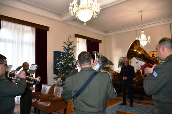 Συγκεκριμένα, ο κ. Καλαφάτης άκουσε τα κάλαντα κατά σειράν από τις μπάντες του Γ’ Σώματος Στρατού και της Ελληνικής Αστυνομίας, από τη Φιλαρμονική του Δήμου Θεσσαλονίκης και την παιδική χορωδία των Εκπαιδευτηρίων “Απόστολος Παύλος”.