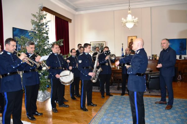 Μπάντες και Χορωδίες έψαλαν, σήμερα, τα κάλαντα, στο γραφείο του Υφυπουργού Εσωτερικών, αρμόδιου για θέματα Μακεδονίας – Θράκης κ. Σταύρου Καλαφάτη, στο Διοικητήριο.