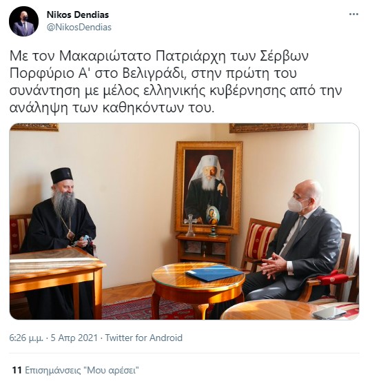 «Με τον Μακαριώτατο Πατριάρχη των Σέρβων Πορφύριο Α’ στο Βελιγράδι, στην πρώτη του συνάντηση με μέλος ελληνικής κυβέρνησης από την ανάληψη των καθηκόντων του» αναφέρει ο Υπουργός Εξωτερικών κ. Νίκος Δένδιας με ανάρτησή του στα Μέσα Κοινωνικής Δικτύωσης.