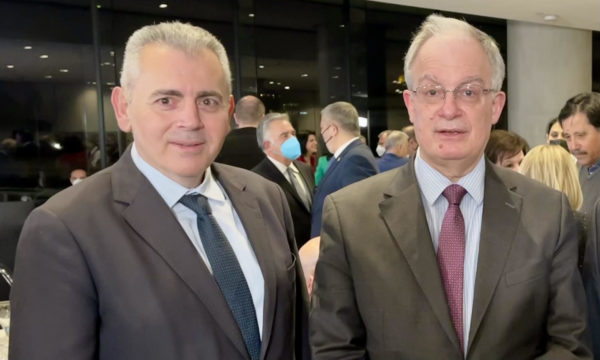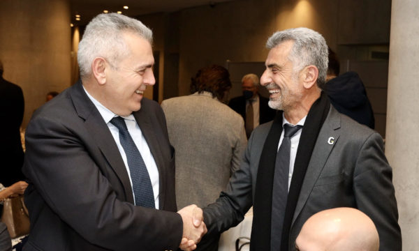 Οι οικοδεσπότες της εκδήλωσης, ο πρόεδρος της Επιτροπής Ελληνισμού της Διασποράς της Βουλής Σάββας Αναστασιάδης, και η πρόεδρος της ΠΟΕΣΥ Έλενα Ριζεάκου, καλωσορίζουν τον Μάξιμο Χαρακόπουλο.