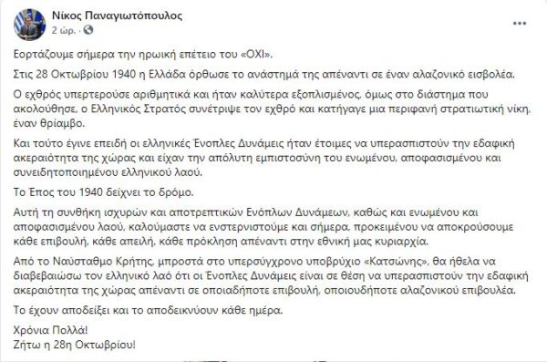Ο υπουργός Εθνικής Αμύνης κ. Νίκος Παναγιωτόπουλος με μήνυμά του στα μέσα κοινωνικής δικτύωσης έκανε αναφορά στην σημερινή επέτειο των 80 ετών από την Ημέρα του ΟΧΙ και το έπος του 1940 σημειώνοντας χαρακτηριστικά ότι “Το Έπος του 1940 δείχνει το δρόμο”. Από το υποβρύχιο “Κατσώνης” που επισκέφτηκε με τον πρωθυπουργό κ. Κυριάκο Μητσοτάκη διαβεβαίωσε ότι οι “Ένοπλες Δυνάμεις είναι σε θέση να υπερασπιστούν την εδαφική ακεραιότητα της χώρας”.