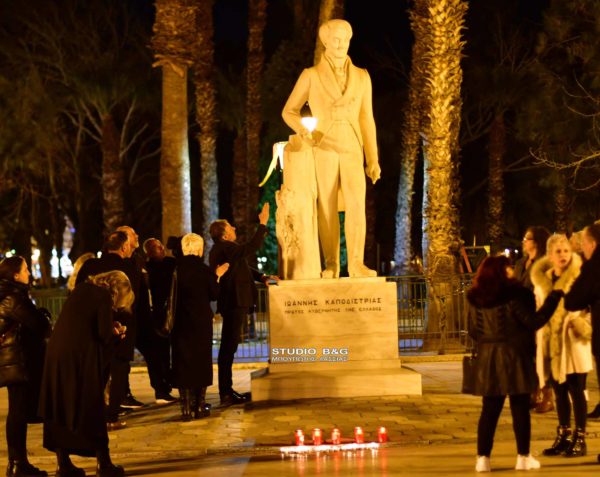 Ο σύλλογος Αρματωμένοι Μοραΐτες από το Ναύπλιο άναψε 57 κεράκια, μπροστά στο άγαλμα του πρώτου κυβερνήτη της Ελλάδος Ιωάννη Καποδίστρια, σε ένδειξη μνήμης για τους νεκρούς του τραγικού δυστυχήματος του ΟΣΕ στα Τέμπη, Πέμπτη 9 Μαρτίου 2023.
