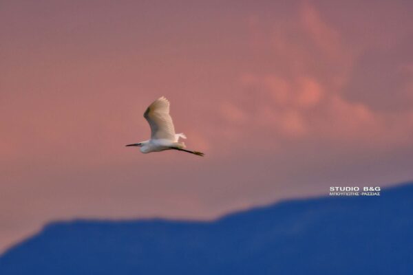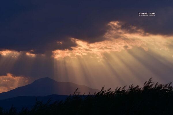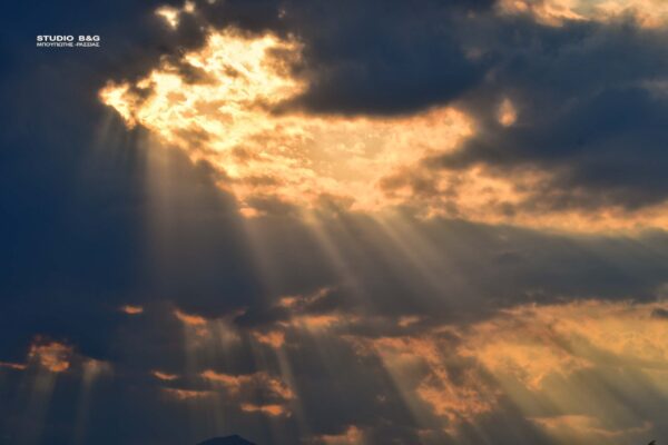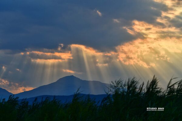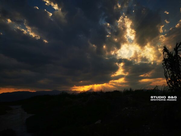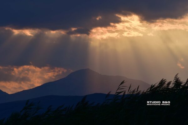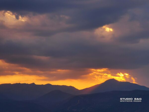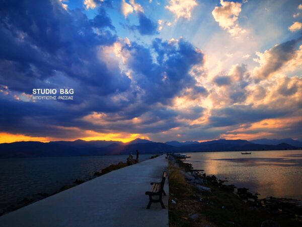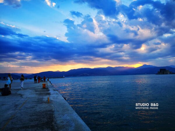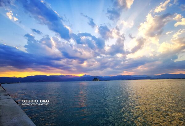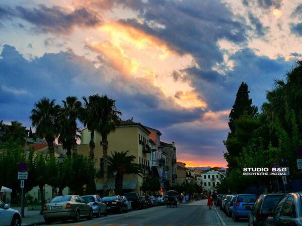 Ο ήλιος καθώς φεύγει μέσα από τα σύννεφα, δίνει στον ουρανό άλλοτε αυτό το βαθύ κόκκινο χρώμα, άλλοτε το πορτοκαλί ή το κίτρινο και άλλες φόρες μπερδεύονται όλα μαζί σε μια βιολετί απόχρωση, που με φόντο την πόλη του Ναυπλίου συνθέτουν έναν πίνακα ζωγραφικής που μόνο κάποιος μεγάλος ζωγράφος θα μπορούσε να εμπνευστεί.