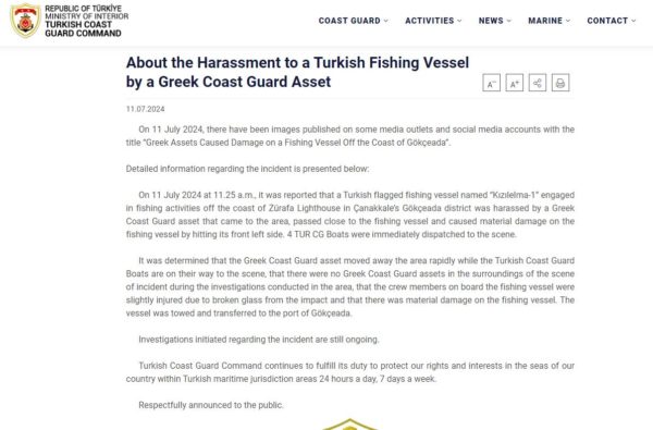 “Στις 11 Ιουλίου, στις 11:25 π.μ., αναφέρθηκε ότι αλιευτικό σκάφος με τουρκική σημαία το οποίο έφερε την ονομασία “Kızılelma-1”, ψάρευε ανοικτά του Φάρου της Ζουράφας στην περιοχή Çanakkale’s Gökçeada, όταν παρενοχλήθηκε από την ελληνική ακτοφυλακή, η οποία ήρθε στο σημείο, πέρασε κοντά από το αλιευτικό προκαλώντας του υλικές ζημιές, καθώς το χτύπησε στην μπροστινή αριστερή πλευρά. Στο σημείο έσπευσαν αμέσως 4 σκάφη της τουρκικής ακτοφυλακής.