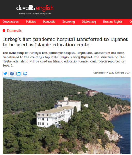 Το Σανατόριο ήταν το πρώτο πανδημικό νοσοκομείο στην ιστορία του τουρκικού κράτους και πλέον, σύμφωνα με την ιστοσελίδα duvarenglish.com μεταβιβάζεται στην κρατική Διεύθυνση Θρησκευτικών Υποθέσεων (Ιδρυμα Ντιγιανέτ).