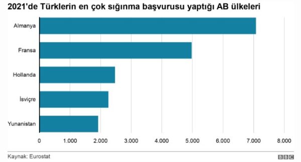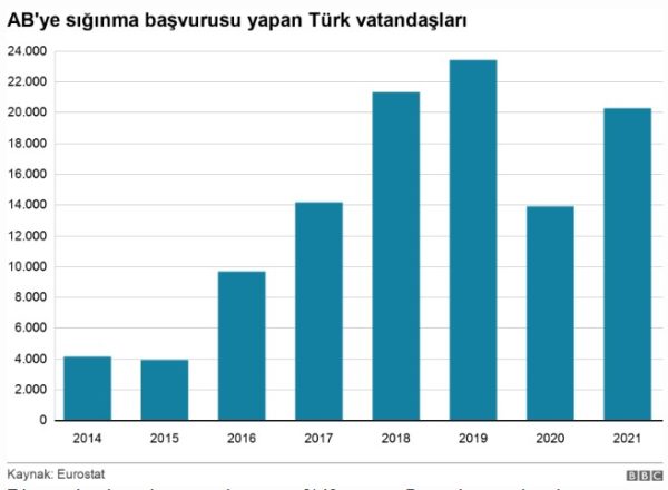 Η ΕΕ σημείωσε αύξηση 45% στις αιτήσεις ασύλου από Τούρκους υπηκόους το 2021, σύμφωνα με νέα στοιχεία που έδωσε στη δημοσιότητα η Eurostat, και όπως μετέδωσε το BBC Turkish.