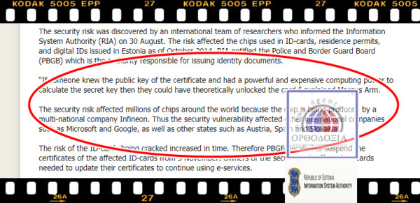 Διεθνείς επιστήμονες ενημέρωσαν τις εσθονικές αρχές ότι έχουν εντοπίσει ένα «security risk» (κίνδυνος ασφαλείας), κατ’ ουσίαν ένα καθόλα υπαρκτό «flaw», μία “ατέλεια” στα υπερσύγχρονα «σούπερ – τσιπς», τα οποία ευρίσκονταν πάνω στις ταυτότητες 750.000 Εσθονών πολιτών. Μεταφορικά, ως “flaw” θα μεταφράσουμε μία μικρή ή μεγάλη “τρύπα”, πάνω, ας πούμε, σε κάποιο ένδυμα, ένα πουλόβερ, παραδείγματος χάριν, όπου, από μία μικρή τρυπούλα, μία “ατέλεια” του αρχικού πλεξίματος, μπορείς εσύ να πιαστείς και να αποσυνθέσεις όλες τις άκρες του μαλλιού.