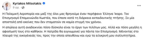 «Η Πολεμική Αεροπορία και μαζί της όλοι μας θρηνούμε έναν περήφανο Έλληνα Ίκαρο. Τον επισμηναγό Επαμεινώνδα Κωστέα, που έπεσε κατά τη διάρκεια εκπαιδευτικής πτήσης» αναφέρει σε ανάρτηση του ο Πρωθυπουργός Κυριάκος Μητσοτάκης για την απώλεια του πιλότου που έχασε τη ζωή του εν ώρα καθήκοντος, «σε μία αποστολή από εκείνες που δεν σταματούν σε καμία στιγμή του χρόνου».