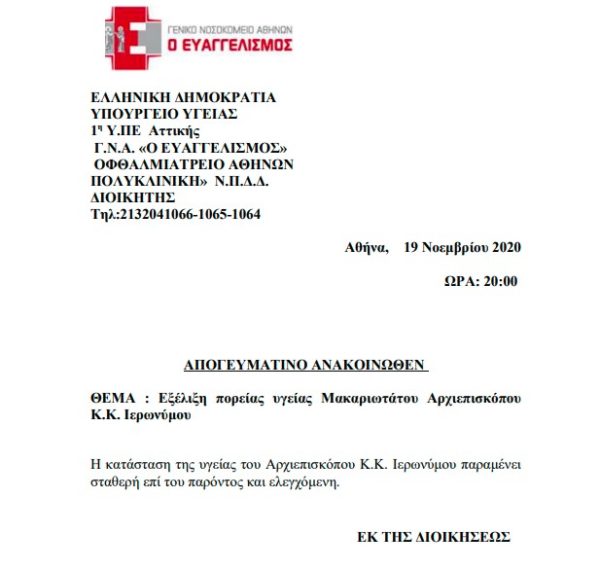 Το νοσοκομείο Ευαγγελισμός για την πορεία νοσηλείας του Αρχιεπισκόπου Ιερωνύμου