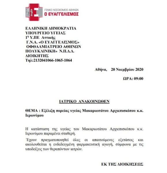 Το νοσοκομείο Ευαγγελισμός για την πορεία νοσηλείας του Αρχιεπισκόπου Ιερωνύμου