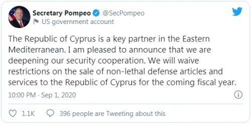 Σε ανάρτησή του στο Twitter ο Υπουργός Εξωτερικών των ΗΠΑ, Μάικ Πομπέο, έγραψε μεταξύ άλλων ότι «η Κυπριακή Δημοκρατία είναι βασικός εταίρος στην Ανατολική Μεσόγειο».