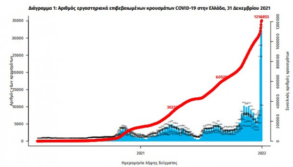 Τα νέα εργαστηριακά επιβεβαιωμένα κρούσματα της νόσου που καταγράφηκαν τις τελευταίες 24 ώρες είναι 40.560 , εκ των οποίων 32 εντοπίστηκαν κατόπιν ελέγχων στις πύλες εισόδου της χώρας. Ο συνολικός αριθμός των κρουσμάτων ανέρχεται σε 1.210.853 (ημερήσια μεταβολή +3.5%), εκ των οποίων 50.3% άνδρες. Με βάση τα επιβεβαιωμένα κρούσματα των τελευταίων 7 ημερών, 231 θεωρούνται σχετιζόμενα με ταξίδι από το εξωτερικό και 1.386 είναι σχετιζόμενα με ήδη γνωστό κρούσμα.