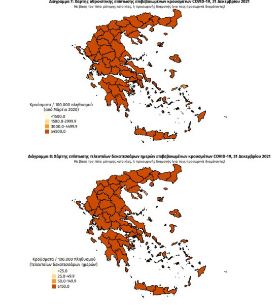 Τα στοιχεία που παρουσιάζονται αφορούν περιστατικά από την επιδημιολογική επιτήρηση της νόσου από το νέο κορονοϊό (COVID19), με βάση τα δεδομένα που έχουν δηλωθεί στον ΕΟΔΥ και καταγραφεί μέχρι τις 31 Δεκεμβρίου 2021 (ώρα 15:00).