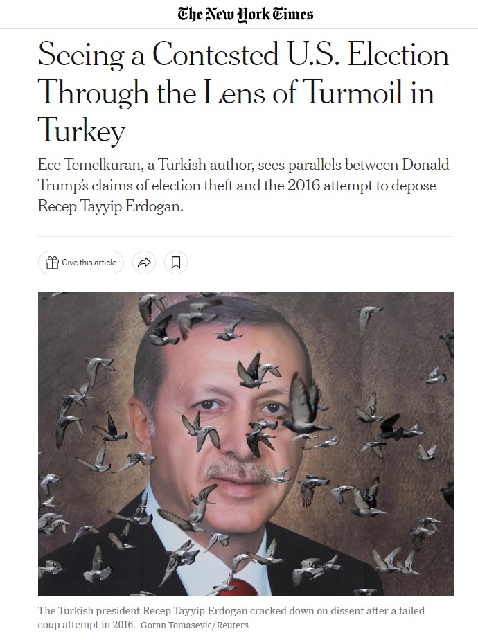 Σε συνέντευξη που παραχώρησε στους New York Times, η συγγραφέας παραλληλίζει την αμφισβήτηση των αποτελεσμάτων των αμερικανικών προεδρικών εκλογών από τον πρώην Πρόεδρο Ντόναλντ Τραμπ, με το αποτυχημένο πραξικόπημα στην Τουρκία το 2016 και τις διώξεις που ακολούθησαν από τον Ερντογάν εναντίον των πολιτικών του αντιπάλων.