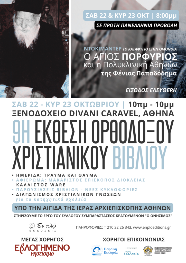 Εκδοχή του ντοκιμαντέρ που αφορά κυρίως στον Άγιο Πορφύριο και την δράση του στην Πολυκλινική, θα παρουσιαστεί σε πρώτη πανελλήνια προβολή στην Αθήνα, στην έκθεση χριστιανικού βιβλίου που διοργανώνουν οι εκδόσεις Εν Πλω, το Σαββατοκύριακο 22 και 23 Οκτωβρίου στις 20.00.