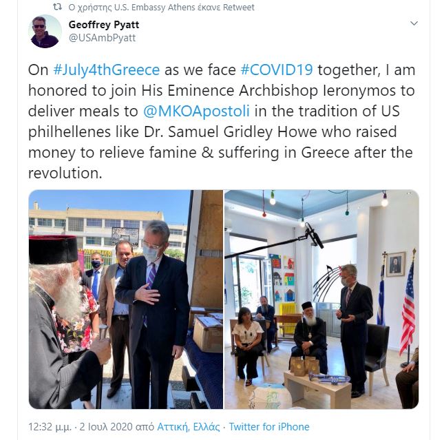 Με μήνυμά του στο Twitter ο κ. Πάιτ τονίζει ότι στις 4 Ιουλίου, “καθώς αντιμετωπίζουμε μαζί τον COVID-19 , είναι τιμή μου να συνοδεύσω τον Αρχιεπίσκοπο Ιερώνυμο στην διανομή γευμάτων στην ΜΚΟ Αποστολή”