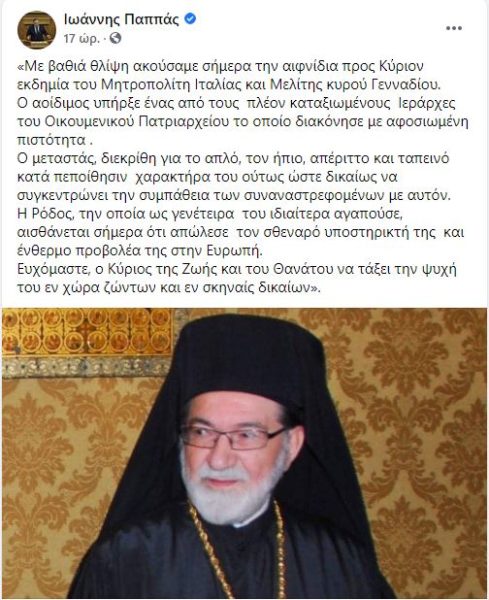 Συλλυπητήριο μήνυμα έστειλε ο Βουλευτής Δωδεκανήσου κ. Ιωάννης Κ. Παππάς για την προς Κύριον εκδημία του Μητροπολίτου Ιταλίας και Μελίτης κυρού Γενναδίου τον οποίο χαρκατήρισε ως έναν “από τους πλέον καταξιωμένους Ιεράρχες του Οικουμενικού Πατριαρχείου”.