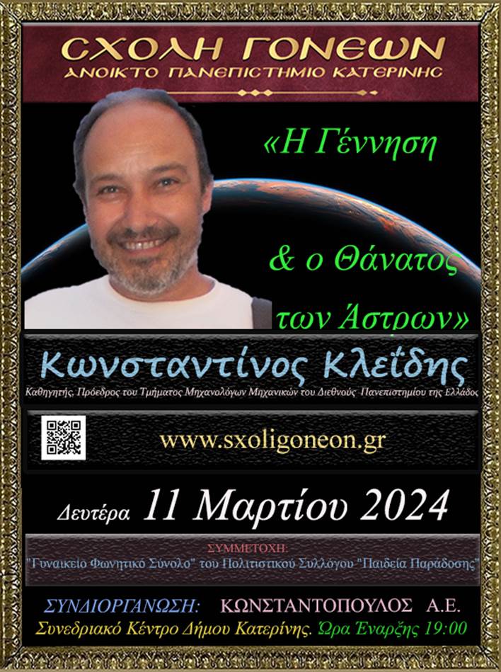 O αστροφυσικός – κοσμολόγος κ. Κωνσταντίνος Κλεΐδης σε μια μοναδική παρουσίαση της σύγχρονης γνώσης για τον κόσμο των άστρων με ξεναγό και συνοδοιπόρο την επιστήμη της εποχής μας την Σχετικιστική Αστροφυσική, την Δευτέρα 11 Μαρτίου 2024, στην Σχολή Γονέων – Ανοικτό Πανεπιστήμιο Κατερίνης.