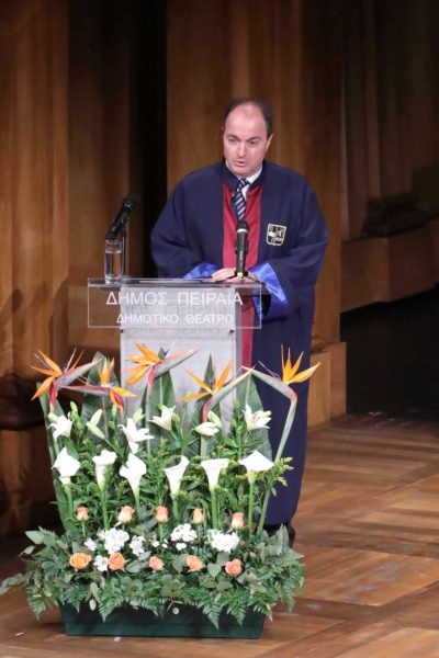 Η τελετή ξεκίνησε με την προσφώνηση από τον Πρύτανη του Πανεπιστημίου Πειραιώς, Καθηγητή Μιχαήλ Σφακιανάκη και τον Κοσμήτορα της Σχολής Ναυτιλίας και Βιομηχανίας, Καθηγητή Άγγελο Παντουβάκη και ακολούθησε η παρουσίαση του έργου του τιμωμένου (Laudatio) από τον Πρόεδρο του Τμήματος Ναυτιλιακών Σπουδών Καθηγητή Γιάννη Θεοτοκά.