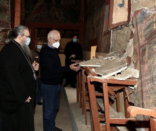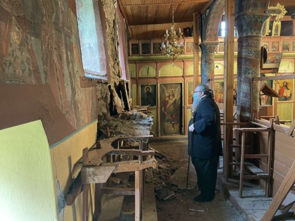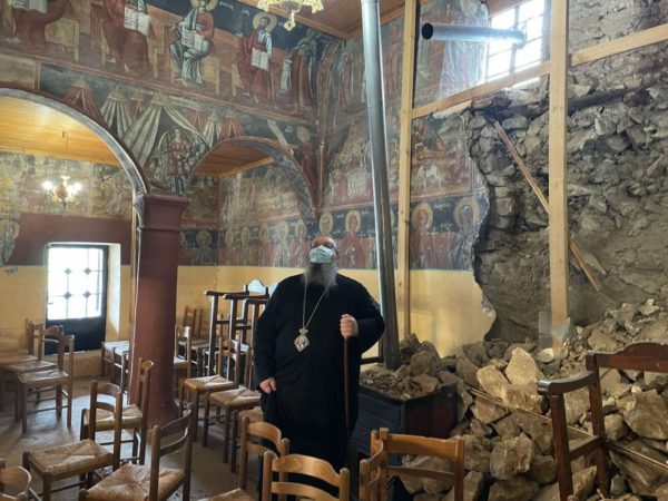Ο δεσπότης μέσα στα συντρίμμια της εκκλησιάς