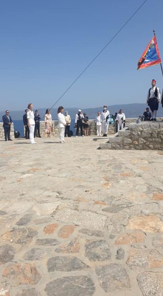 Η επίσκεψη της κυρίας Σακελλαροπούλου ολοκληρώθηκε με τη ρίψη στεφάνου στη θάλασσα προς τιμήν των Ναυμάχων του 1821.