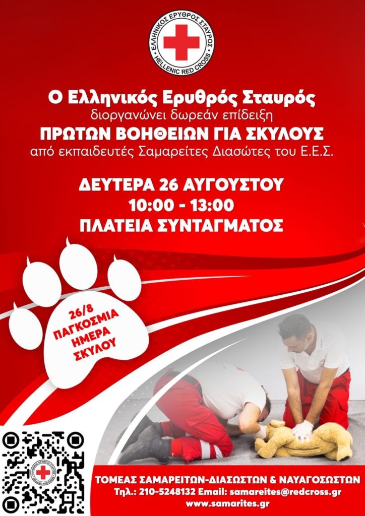 Ο Ελληνικός Ερυθρός Σταυρός (Ε.Ε.Σ), με αφορμή την Παγκόσμια Ημέρα σκύλου (26/8), διοργανώνειμεγάλη δράση τη Δευτέρα 26 Αυγούστου και ώρες 10:00 – 13:00, στην Πλατεία Συντάγματος (πλησίον σταθμού Μετρό), με στόχο την εξοικείωση του κοινού με τις Πρώτες Βοήθειες για σκύλους. Πρόκειται για το πρωτοποριακό και καινοτόμο πρόγραμμα εκπαίδευσης Πρώτων Βοηθειών για σκύλους που υλοποιεί ο Ε.Ε.Σ. σε όλη την Ελλάδα.