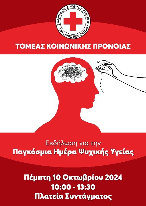 Με αφορμή τον εορτασμό της Παγκόσμιας Ημέρας Ψυχικής Υγείας, την Πέμπτη, 10 Οκτωβρίου, ο Ελληνικός Ερυθρός Σταυρός διοργανώνει στην Πλατεία Συντάγματος, από τις 10:00 έως τις 13:30, τα εγκαίνια της Κινητής Μονάδαςτου Ε.Ε.Σ. για την Ψυχοκοινωνική Υποστήριξη Ευάλωτων Ομάδων του πληθυσμού. Η εκδήλωση θα επενδυθεί μουσικά από τηνμπάντα του Δήμου Αθηναίων.