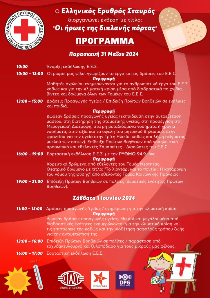 Κατά τη διάρκειά της, εθελοντές και προσωπικό του Ε.Ε.Σ. από όλους τους Τομείς (Υγείας, Κοινωνικής Πρόνοιας, Σαμαρειτών-Διασωστών, Ναυαγοσωστών & Νεότητας) θα ενημερώνουν τον κόσμο για το έργο και τις δράσεις του Ελληνικού Ερυθρού Σταυρού. Σημειώνεται ότι στον χώρο θα υπάρχει μεγάλη έκθεση εξοπλισμού του Ε.Ε.Σ., όπου το κοινό θα μπορεί να γνωρίσει από κοντά τους «Ήρωες της διπλανής πόρτας» και να ενημερωθεί αναλυτικά για το έργο τους.
