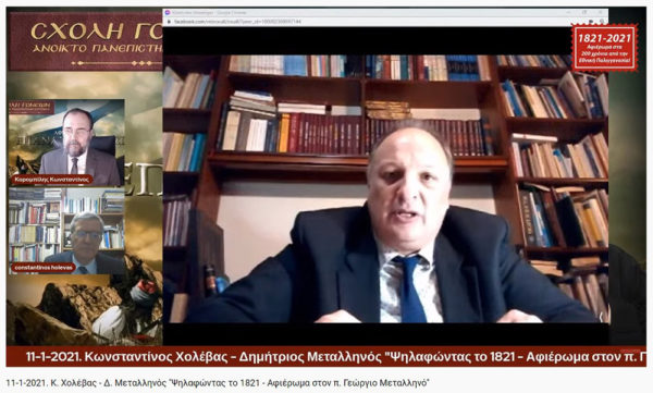 Συνεχίζοντας το αφιέρωμα για τα 200 χρόνια από την Εθνική παλιγγενεσία η Σχολή Γονέων – Ανοιχτό Πανεπιστήμιο Κατερίνης πραγματοποίησε την Δευτέρα 11-1-2021 διαδυακτική ομιλία- εκδήλωση με θέμα «Ψηλαφώντας το 1821 – Αφιέρωμα στον π. Γ. Μεταλληνό» με ομιλητές τον κ. Δημήτρη Μεταλληνό Δρ. Ιστορίας και Πρόεδρο Δημ. Συμβουλίου Κεντρικής Κέρκυρας και τον κ. Κωνσταντίνο Χολέβα πολιτικό Επιστήμονα και συγγραφέα. Οι διακεκριμένοι ομιλητές ανέπτυξαν το θέμα και αναφέρθηκαν διεξοδικά στο έργο του μακαριστού πατρός Γεωργίου Μεταλληνού.