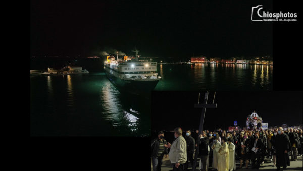 Συγκινητικές στιγμές έζησαν οι ταξιδιώτες του πλοίου Διαγόρας στη Χίο όπου ο επιτάφιος του Αγίου Γεωργίου Φρουρίου τους περίμενε στο λιμάνι.