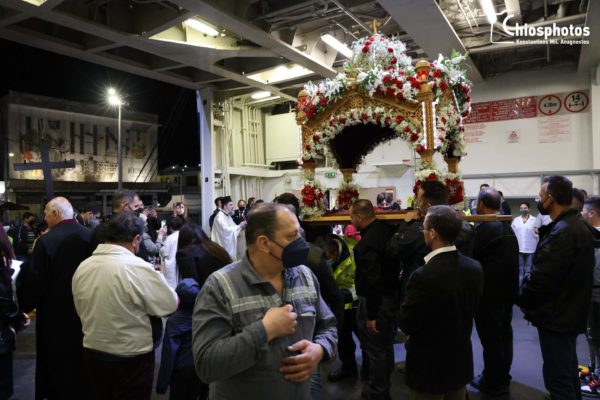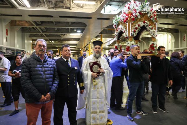 Ο Καπετάνιος υποδέχτηκε τον Ιερέα και τους πιστούς στη μπουκαπόρτα και στη συνέχεια έγινε η περιφορά του εντός του πλοίου μαζί με το πλήρωμα και τους επιβάτες.
