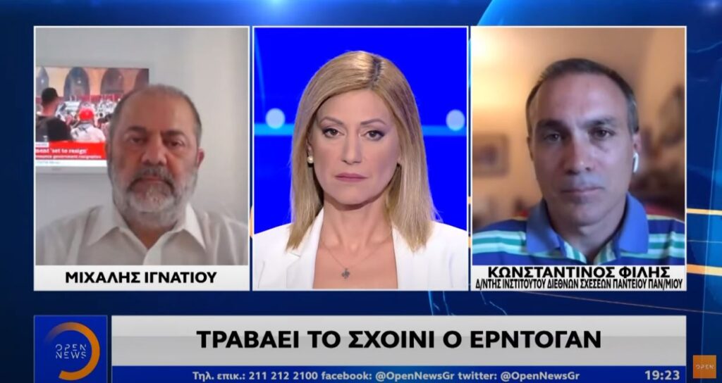 Ο διευθυντής Ινστιτούτου Διεθνών Σχέσεων Παντείου Πανεπιστημίου Κωνσταντίνος Φίλης και ο δημοσιογράφος Μιχάλης Ιγνατίου σχολίασαν τις εξελίξεις στα ελληνοτουρκικά στο κεντρικό δελτίο ειδήσεων του OPEN και έδωσαν τις εκτιμήσεις τους για πιθανό θερμό επεισόδιο με την Τουρκία μετά την είσοδο του Ορούτς Ρέις εντός της ελληνικής υφαλοκρηπίδας.