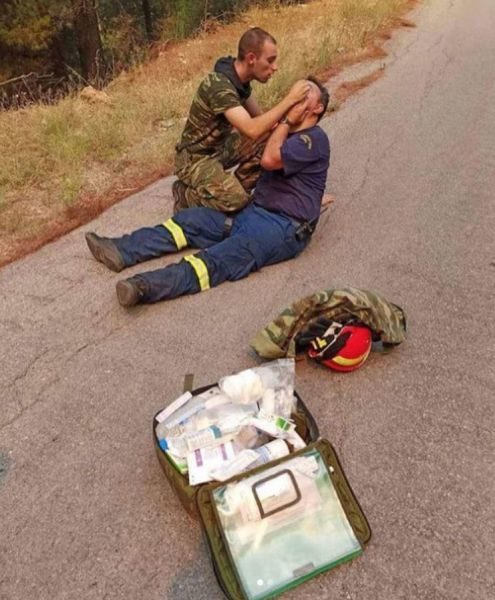 Τον γύρο του διαδικτύου κάνει μια συγκλονιστική φωτογραφία με πρωταγωνιστές έναν στρατιώτη κι έναν πυροσβέστη, με τον πρώτο να παρέχει τις πρώτες βοήθειες στον δεύτερο, σε ένα από τα πολλά πύρινα μέτωπα που καίνε στη χώρα.