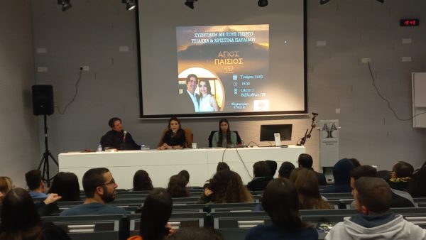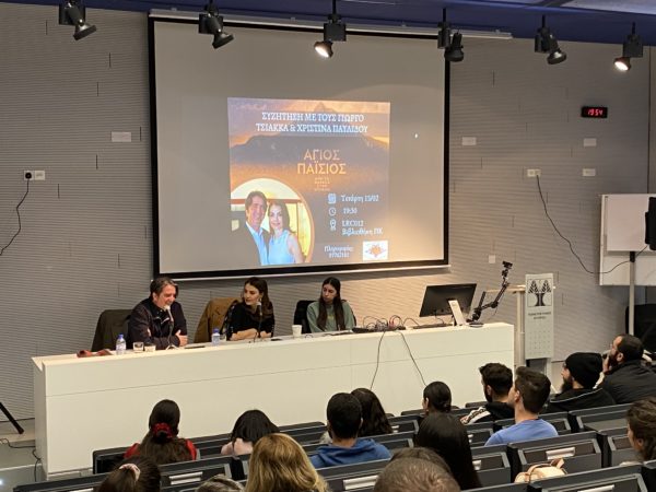 Ο σεναριογράφος και ηθοποιός Γιώργος Τσιάκκας και η ηθοποιός Χριστίνα Παυλίδου, παρεβρέθηκαν στο Πανεπιστήμιο Κύπρου σε εκδήλωση του Ομίλου Ορθόδοξης και Ελληνικής Παράδοσης του ομωνύμου Πανεπιστημίου, που πραγματοποιήθηκε με αφορμή την προσφάτως προβληθείσα σειρά με τον θαυμαστό βίο του Αγίου Παΐσίου με τίτλο: «Άγιος Παΐσιος, από τα Φάρασα στον ουρανό».