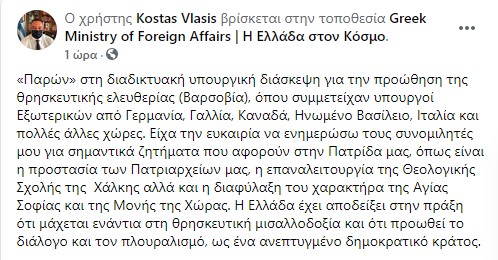 Ο υφυπουργός Εξωτερικών κ. Κωνσταντίνος Βλάσης συμμετείχε στη διαδικτυακή υπουργική διάσκεψη για την θρησκευτική ελευθερία και ενημέρωσε τους συνομιλητές του, υπουργούς Εξωτερικών από Ευρωπαϊκές και όχι μόνο χώρες, για θέματα που αφορούν την Ελλάδα και την Ορθοδοξία με ιδιαίτερες αναφορές στην Αγία Σοφία, τη Μονή της Χώρας και τη Θεολογική Σχολή της Χαλκής και την προστασία των Πατριαρχείων.