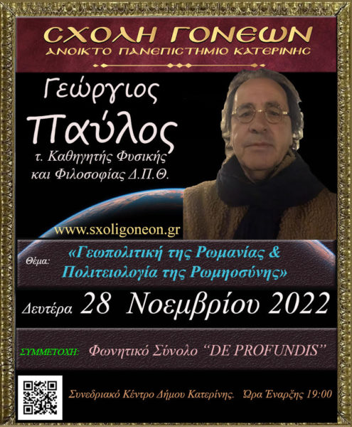 Ο π. Καθηγητής Φυσικής στο Δημοκρίτειο Πανεπιστήμιο Θράκης (Δ.Π.Θ.) Γεώργιος Π. Παύλος την Δευτέρα 28 Νοεμβρίου είναι ο επίσημος ομιλητής και καλεσμένος της Σχολής Γονέων – Ανοικτό Πανεπιστήμιο Κατερίνης. Το θέμα της ομιλίας του κ. Παύλου είναι το: «Γεωπολιτική της Ρωμανίας & Πολιτειολογία της Ρωμηοσύνης».