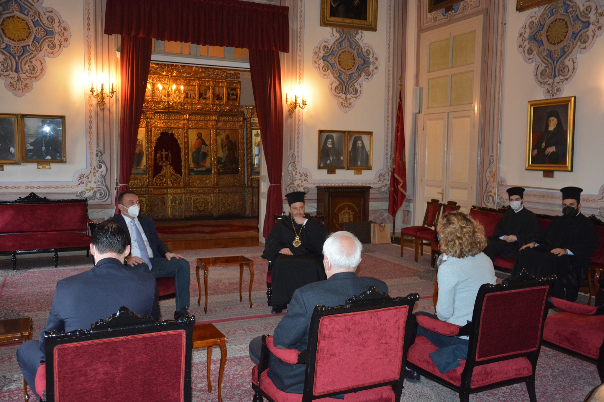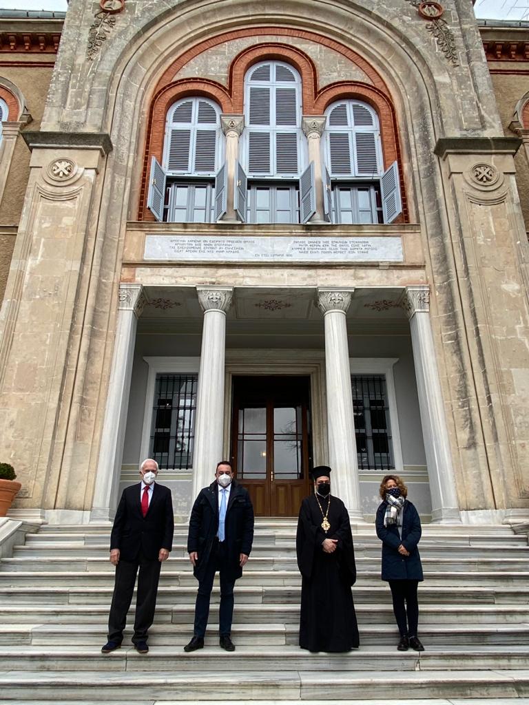 Επίσημη επίσκεψη πραγματοποίησε σήμερα, 19/03/2021, στη Θεολογική Σχολή ο Έλληνας Υφυπουργός Εξωτερικών Αρμόδιος για τον Απόδημο Ελληνισμό, Κωνσταντίνος Βλάσης, συνοδευόμενος από τον Έλληνα Πρέσβη στην Άγκυρα Έξοχ. κ. Μ. Διαμέση και την Γενική Πρόξενο της Πόλεως κ. Γ. Σουλτανοπούλου. Οι Έλληνες αξιωματούχοι έγιναν δεκτοί υπό του Καθηγουμένου, Θεοφιλεστάτου Επισκόπου Αραβισσού κ. Κασσιανού, και της περί αυτόν αδελφότητος, και προσκύνησαν στο ναΰδριο της Σχολής. Στη συνέχεια, ξεναγήθηκαν στην Αίθουσα Τελετών της Σχολής, όπου ο Ηγουμένος τους ενημέρωσε για την πλούσια ιστορία της, αλλά και για τα ζητήματα της ανακαίνισης και επαναλειτουργίας της. Αφού επισκέφθηκαν την ιστορική βιβλιοθήκη της Σχολής, οι υψηλοί επισκέπτες παρακάθησαν στην προς τιμήν τους παρατεθείσα τράπεζα.