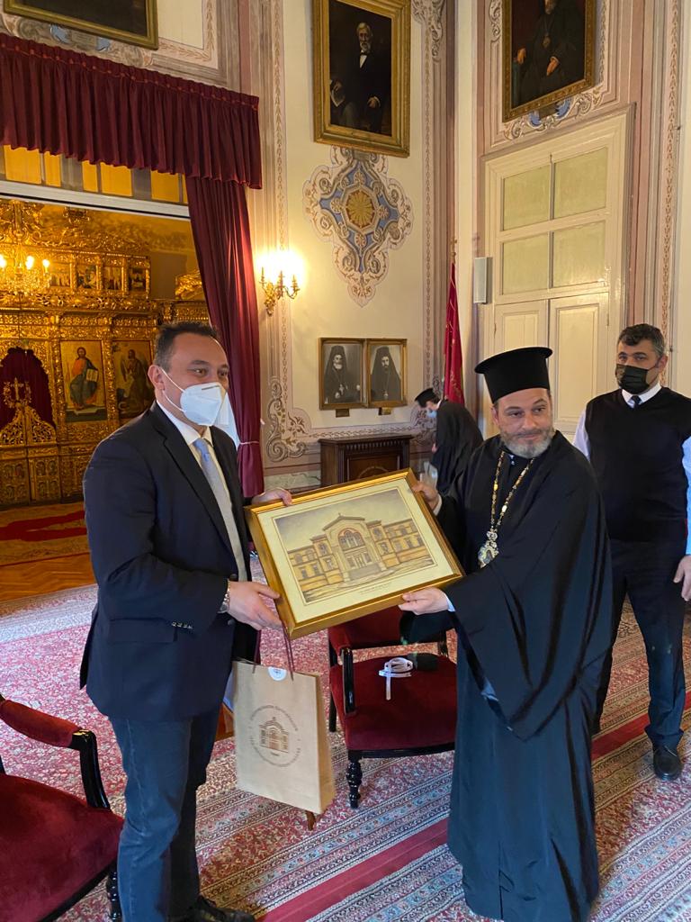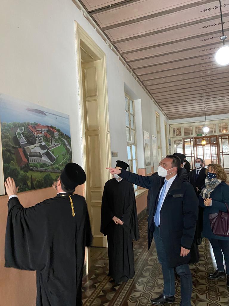 Επίσημη επίσκεψη πραγματοποίησε σήμερα, 19/03/2021, στη Θεολογική Σχολή ο Έλληνας Υφυπουργός Εξωτερικών Αρμόδιος για τον Απόδημο Ελληνισμό, Κωνσταντίνος Βλάσης, συνοδευόμενος από τον Έλληνα Πρέσβη στην Άγκυρα Έξοχ. κ. Μ. Διαμέση και την Γενική Πρόξενο της Πόλεως κ. Γ. Σουλτανοπούλου. Οι Έλληνες αξιωματούχοι έγιναν δεκτοί υπό του Καθηγουμένου, Θεοφιλεστάτου Επισκόπου Αραβισσού κ. Κασσιανού, και της περί αυτόν αδελφότητος, και προσκύνησαν στο ναΰδριο της Σχολής. Στη συνέχεια, ξεναγήθηκαν στην Αίθουσα Τελετών της Σχολής, όπου ο Ηγουμένος τους ενημέρωσε για την πλούσια ιστορία της, αλλά και για τα ζητήματα της ανακαίνισης και επαναλειτουργίας της. Αφού επισκέφθηκαν την ιστορική βιβλιοθήκη της Σχολής, οι υψηλοί επισκέπτες παρακάθησαν στην προς τιμήν τους παρατεθείσα τράπεζα.