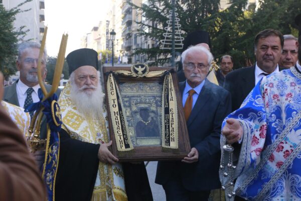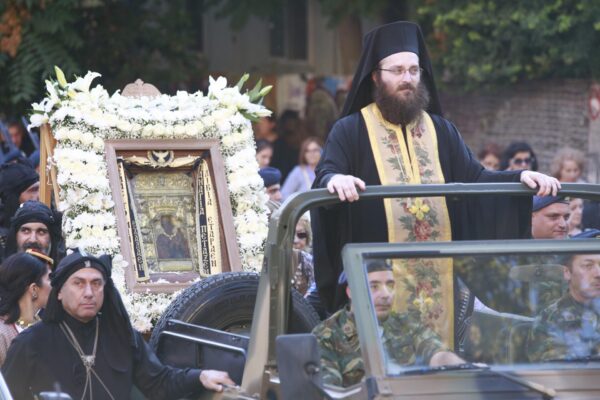 Tο Ιερό Εικόνισμα της Παναγίας Σουμελά μετέφερε ο Σεβασμιώτατος Μητροπολίτης Βεροίας, Ναούσης και Καμπανίας, κ. Παντελεήμων, συνοδευόμενος από τον Πρόεδρο του Σωματείου Παναγία Σουμελά, κ. Γεώργιο Τανιμανίδη και τα μέλη του Διοικητικού Συμβουλίου και παρέλαβε ο οικείος Ποιμενάρχης Παναγιωτατος Μητροπολίτης Θεσσαλονίκης, κ. Άνθιμος, μετα πλειάδος Ιερέων, ιεροδιακόνων και πλήθος λαού.