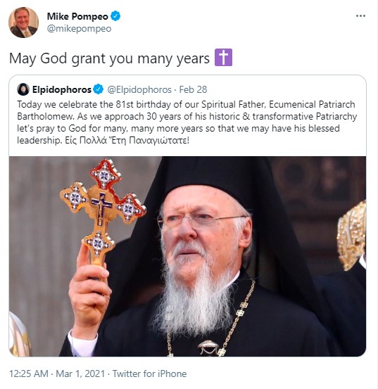Στον Παναγιώτατο Οικουμενικό Πατριάρχη κ.κ. Βαρθολομαίο ευχήθηκε ο πρώην υπουργός Εξωτερικών των Ηνωμένων Πολιτειών Αμερικής κ. Μάικ Πομπέο με μια ανάρτησή του στο twitter όπου αναδημοσίευσε τις ευχές του Σεβασμιωτάτου Αρχιεπισκόπου Αμερικής κ. Ελπιδοφόρου.