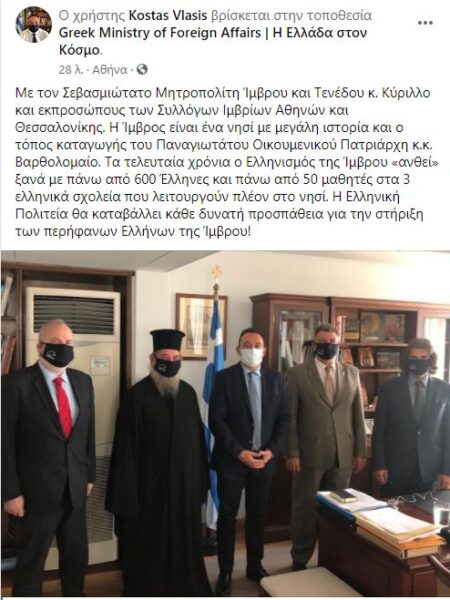 Με τον Σεβασμιώτατο Μητροπολίτη Ίμβρου και Τενέδου κ. Κύριλλο και εκπροσώπους των Συλλόγων Ιμβρίων Αθηνών και Θεσσαλονίκης συναντήθηκε ο κ. Κώστας Βλάσης.  Η Ίμβρος είναι ένα νησί με μεγάλη ιστορία και ο τόπος καταγωγής του Παναγιωτάτου Οικουμενικού Πατριάρχη κ.κ. Βαρθολομαίο. Τα τελευταία χρόνια ο Ελληνισμός της Ίμβρου «ανθεί» ξανά με πάνω από 600 Έλληνες και πάνω από 50 μαθητές στα 3 ελληνικά σχολεία που λειτουργούν πλέον στο νησί. Η Ελληνική Πολιτεία θα καταβάλλει κάθε δυνατή προσπάθεια για την στήριξη των περήφανων Ελλήνων της Ίμβρου.