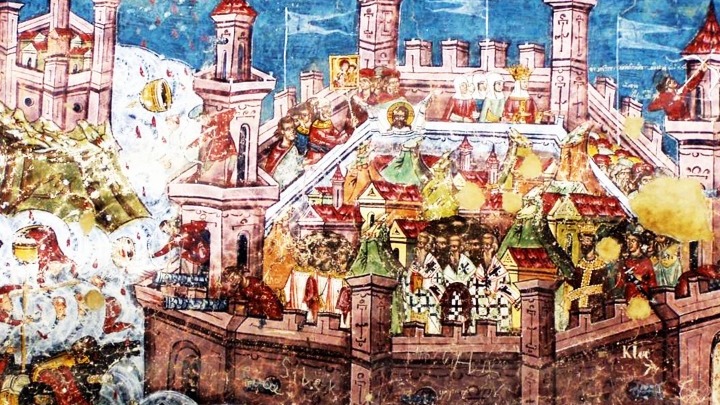 Ο κ. Δένδιας επισυνάπτει στην ανάρτησή του νωπογραφία από άγνωστο καλλιτέχνη στην Εκκλησία της Μονής Moldovita (Ρουμανία) υπό τον τίτλο “29 Μαίου 1453”, στην οποία απεικονίζεται η πολιορκία της Κωνσταντινούπολης.