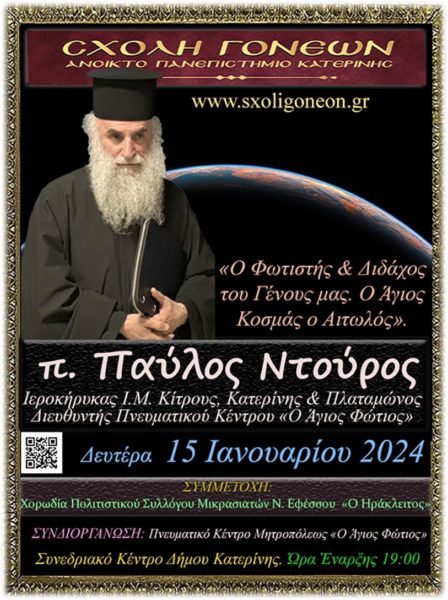 Η τελευταία εκδήλωση του 2023 της Σχολής Γονέων – Ανοικτό Πανεπιστήμιο Κατερίνης ολοκληρώθηκε με επιτυχία την Δευτέρα 19 Δεκεμβρίου 2023 με επίσημο καλεσμένο ομιλητή τον Ιατρό και Ιεραπόστολο π. Ευάγγελο Παπανικολάου.