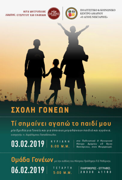 Η Σχολή Γονέων του Πολιτιστικού & Κοινωνικού Κέντρου Αμαρίου «Ο Άγιος Νεκτάριος», της Ι. Μητροπόλεως Λάμπης, Συβρίτου και Σφακίων, διοργανώνει ομιλία υπό το θέμα “Τι σημαίνει να αγαπώ το παιδί μου”, την Κυριακή 3 Φεβρουαρίου και ώρα 6.00μ.μ, με ομιλητή τον Θεολόγο και Συγγραφέα Πρωτοπρεσβύτερο, π. Χαράλαμπο Παπαδόπουλο (π. Λίβυος), Κληρικό της Ι. Μητροπόλεως Γορτύνης και Αρκαδίας.