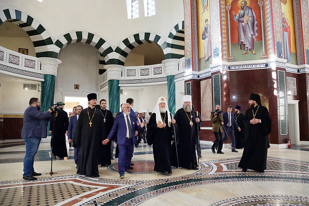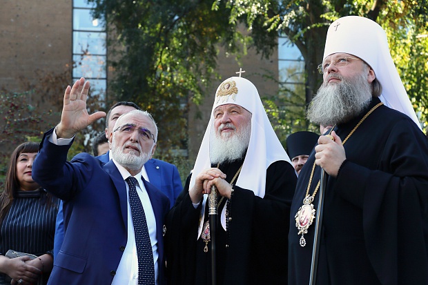 Ο Ιβάν Σαββίδης, Πρόεδρος της Ομοσπονδίας Ελληνικών Κοινοτήτων της Ρωσίας, υποδέχτηκε τον επικεφαλής της Ρωσικής Ορθόδοξης Εκκλησίας στις πύλες του ναού και μίλησε για την ιστορία του, τα στάδια της κατασκευής του ναού και τη σημασία του για την πνευματική ζωή της πόλης.