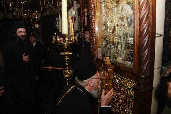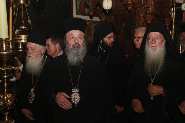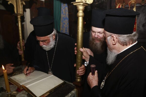 Τον Παναγιώτατο προσφώνησε ο Καθηγούμενος της ι.μ. Κουτλουμουσίου Αρχιμ. Χριστόδουλος και ο Γερ. της Καλύβης π. Χρυσόστομος, ο οποίος προσέφερε αρχιερατική στολή και Εγκόλπια στον Παναγιώτατο, καθώς και Ευαγγέλιο Λιτανείας.