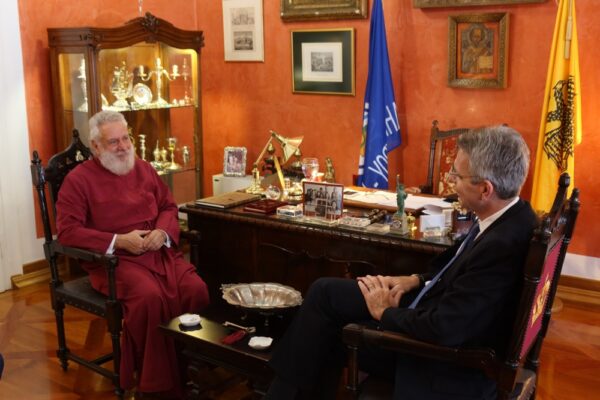 Τον Σεβασμιώτατο κ. Δωρόθεο Β’ επεσκέφθη, κατά την Τετάρτη 4 Δεκεμβρίου 2019, στα Γραφεία της Ιεράς Μητροπόλεως, ο ευρισκόμενος στην Ερμούπολη για την τελετή μεταβίβασης των Ναυπηγείων του «ΝΕΩΡΙΟΥ» στην «ΟΝΕΧ» Εξοχώτατος Πρέσβης των ΗΠΑ στην Ελλάδα κ. Geoffrey R. Pyatt, με τον οποίο συζήτησε θέματα και προβλήματα της Σύρου και των άλλων νησιών της Μητροπόλεως και τον οποίο ευχαρίστησε για τη στήριξή του προς τον Αρχιεπίσκοπο Αμερικής κ. Ελπιδοφόρο και προς τον Διευθύνοντα Σύμβουλο της «ΟΝΕΧ SHIPYARDS» κ. Πάνο Ξενοκώστα, προκειμένου να ευοδοθούν οι προσπάθειές του για την επαναλειτουργία του «ΝΕΩΡΙΟΥ».
