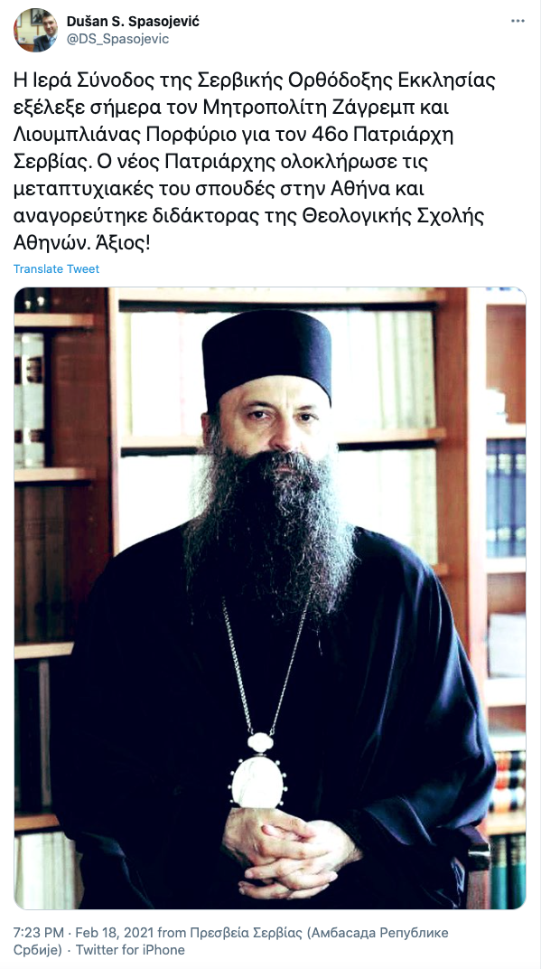 “Η Ιερά Σύνοδος της Σερβικής Ορθόδοξης Εκκλησίας εξέλεξε σήμερα τον Μητροπολίτη Ζάγρεμπ και Λιουμπλιάνας Πορφύριο για τον 46ο Πατριάρχη Σερβίας. Ο νέος Πατριάρχης ολοκλήρωσε τις μεταπτυχιακές του σπουδές στην Αθήνα και αναγορεύτηκε διδάκτορας της Θεολογικής Σχολής Αθηνών. Άξιος!”, αναφέρει το μήνυμα του Σέρβου διπλωμάτη.